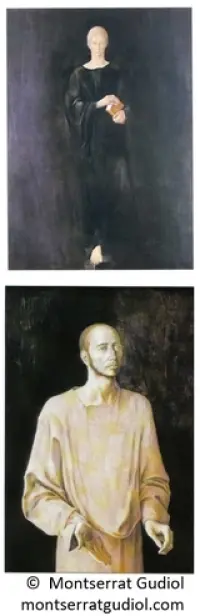 Gudiol hat ansonsten ganz überwiegend Frauen dargestellt. Aber 1983 war sie gebeten worden, für die Benediktiner-Abtei Montserrat, die wie Manresa nahe bei Barcelona liegt, ein Bild des Hl. Benedikt zu schaffen. Es zeigt Benedikt aus dem Halbdunkel kommend, die Ordens-Regel in der Hand, den Blick halb zu Boden mit dem rechten Fuß voraus auf den Betrachter zuschreitend. Er trägt – wie die Benediktiner – ein schwarzes Gewand, aber ganz einfach geschnitten.